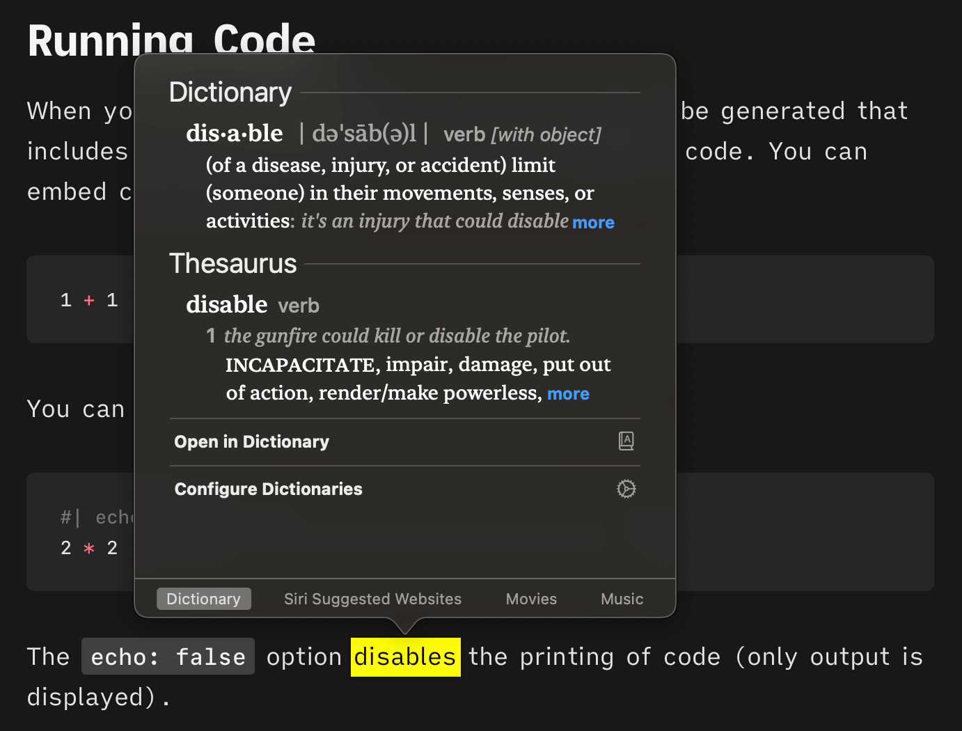 However, lots of these tools don’t work in Positron (or Visual Studio Code, or really any Electron app). There’s a longstanding bug in Chromium/Electron-based apps (like Positron, Visual Studio Code, Obsidian, and others) where some of these writing tools don’t work (this issue is my least favorite thing about Obsidian). Some non-native apps support spellchecking, and most let you look up selected words in the dictionary or thesaurus, but they don’t use macOS’s autocorrect, autocomplete, or Writing Tools.