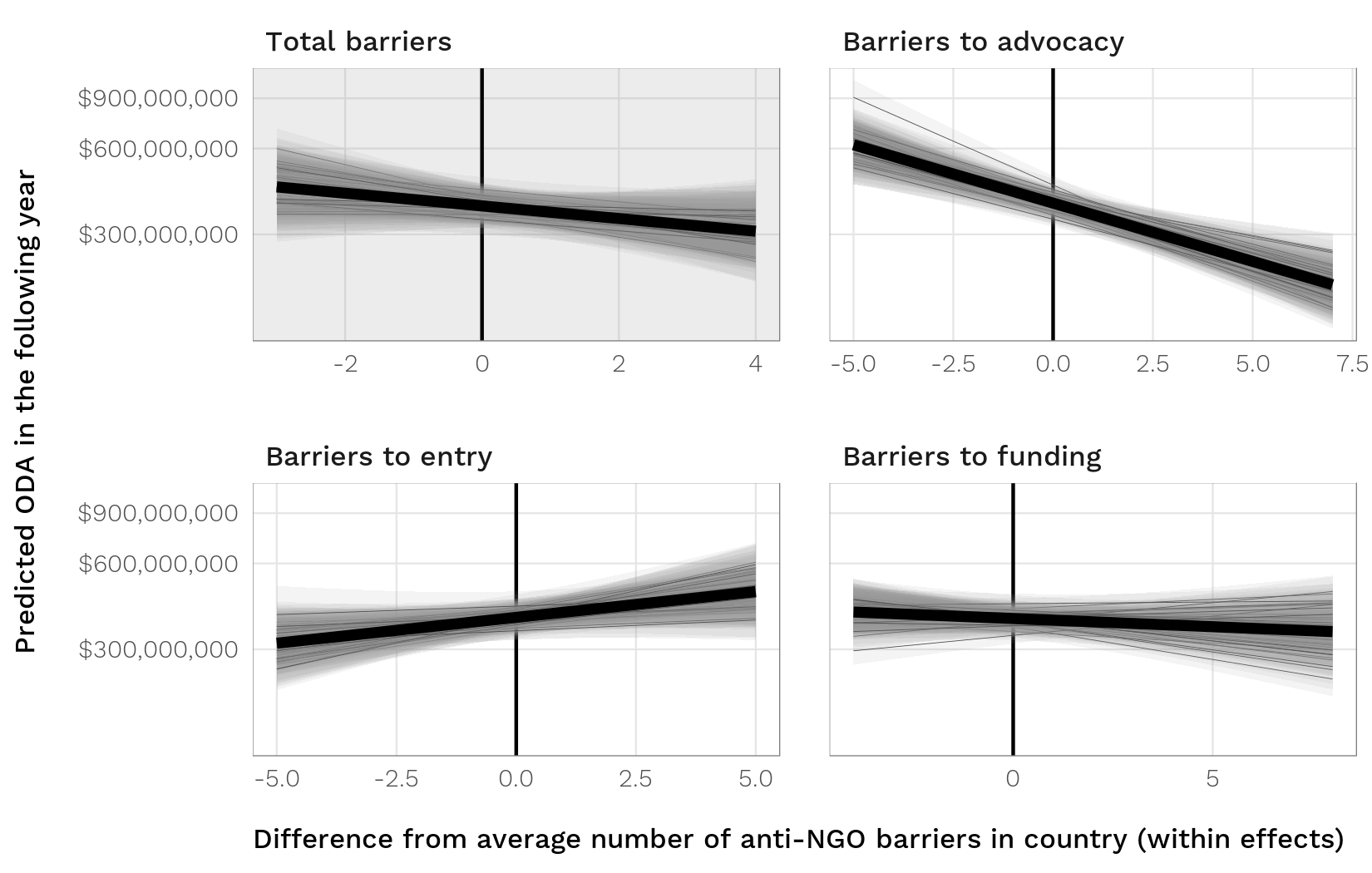 Figure 5: Predicted ODA (foreign aid) across a range of differences from average number of anti-NGO laws in an average country; dark line shows average of 500 draws from posterior distribution.