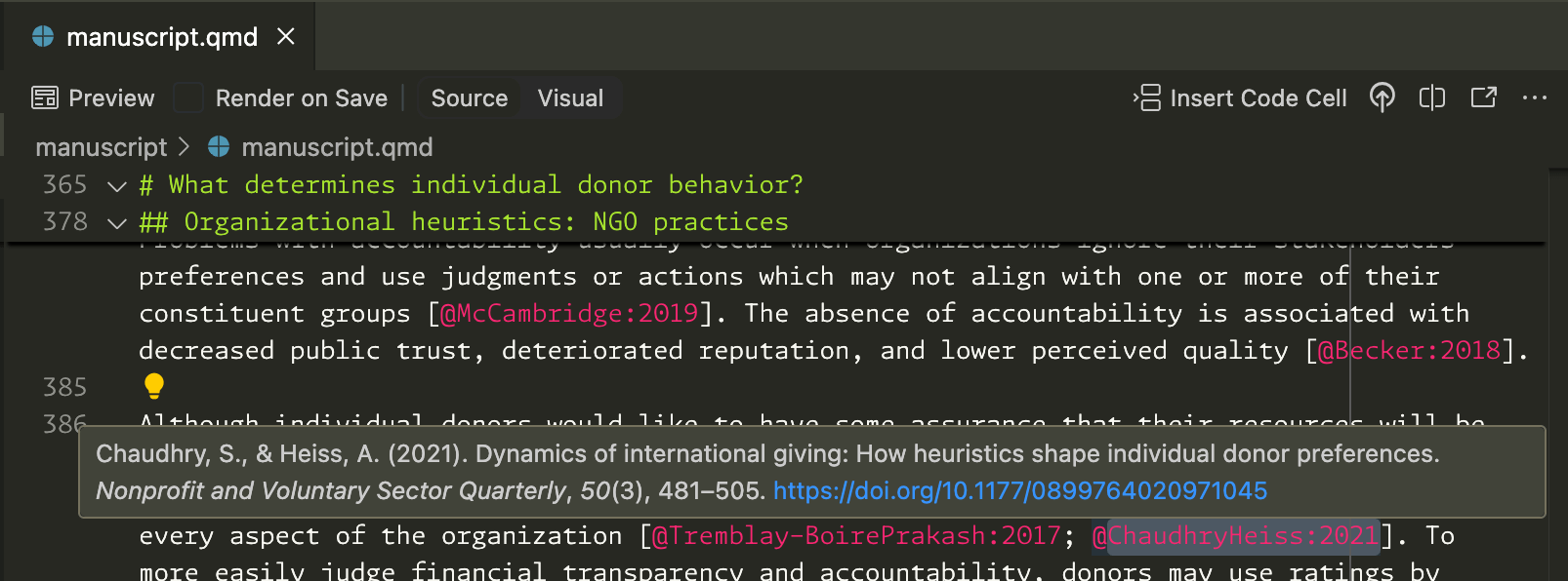 Positron’s Quarto support is really quite robust and it’s full of nice little features like previewing a citation using whatever bibliography style your document is using (Chicago, APA, etc.) when you hover over a citation key: