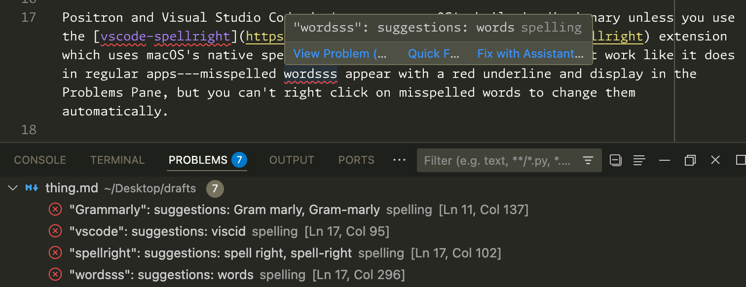 Positron and Visual Studio Code don’t support macOS’s built-in dictionary unless you use the vscode-spellright extension which uses macOS’s native spelling API. However, even then, it doesn’t work like it does in regular apps—misspelled words appear with a red underline and display in the Problems Pane, but you can’t right click on misspelled words to change them automatically.